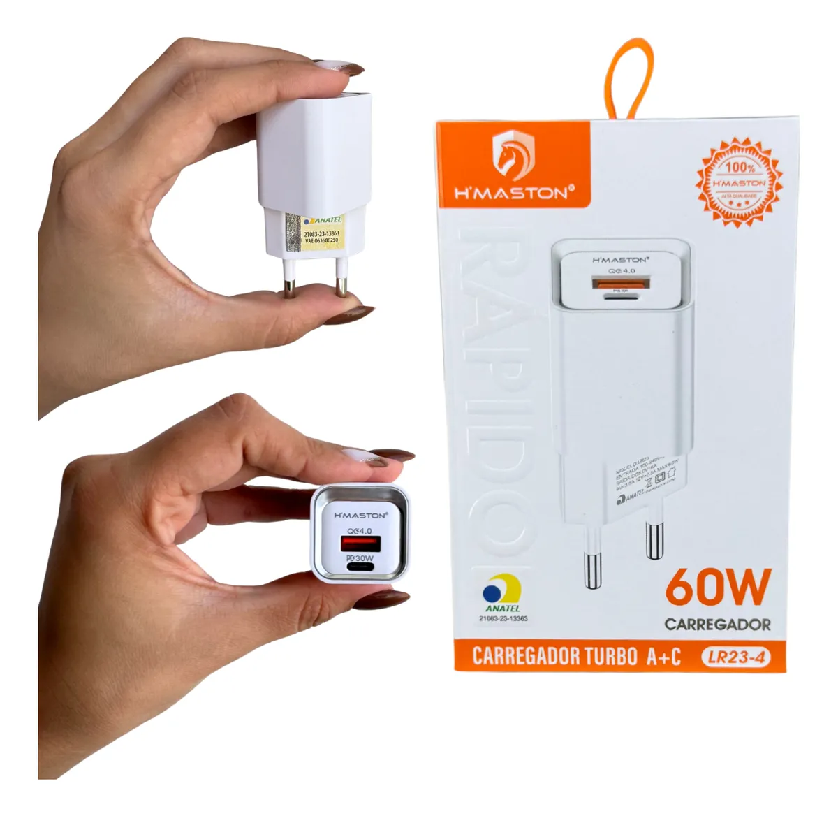 Carregador Ultra Rápido H'maston 60W LR23-4 – Dual Port (USB-C + USB-A) com Selo Anatel