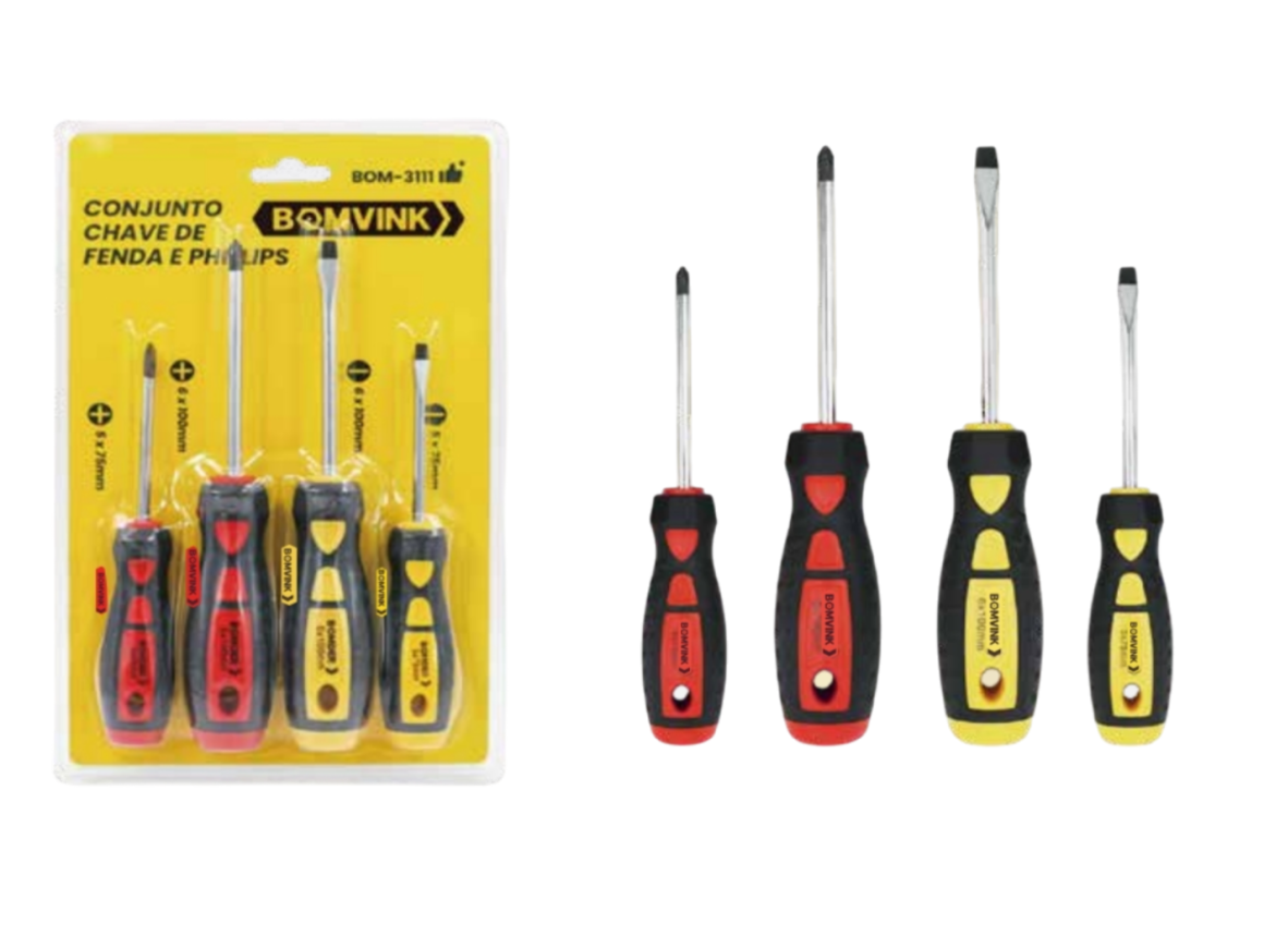 Jogo de Chaves Fenda e Phillips Bomvink BOM-3111 – 4 Peças com Ponta Magnética e Cabo Emborrachado: O Kit Essencial para sua Manutenção!