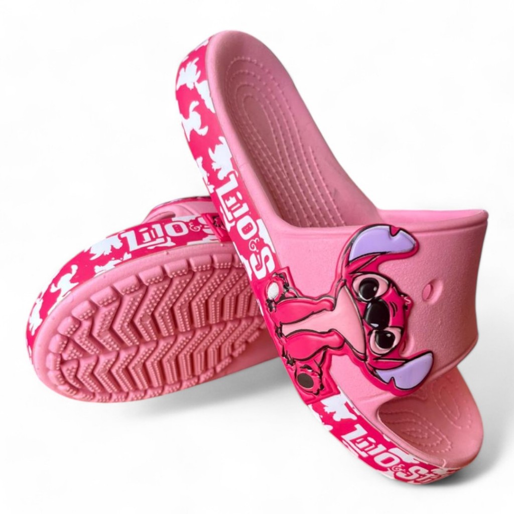 Tema Adorável: O cabedal (tira superior) exibe estampas ou designs dos amados Lilo e Stitch com a cor rosa predominante, conferindo um charme extra e um visual que remete à fofura e à alegria do alien favorito.