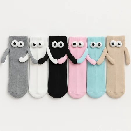 Para manter a força magnética e os detalhes dos olhinhos sempre perfeitos, lave as meias preferencialmente à mão ou em ciclo delicado dentro de um saquinho protetor. Evite o uso de secadoras em temperaturas muito altas para preservar a integridade dos imãs. Seque à sombra e suas meias "amigas" estarão prontas para muitos abraços!