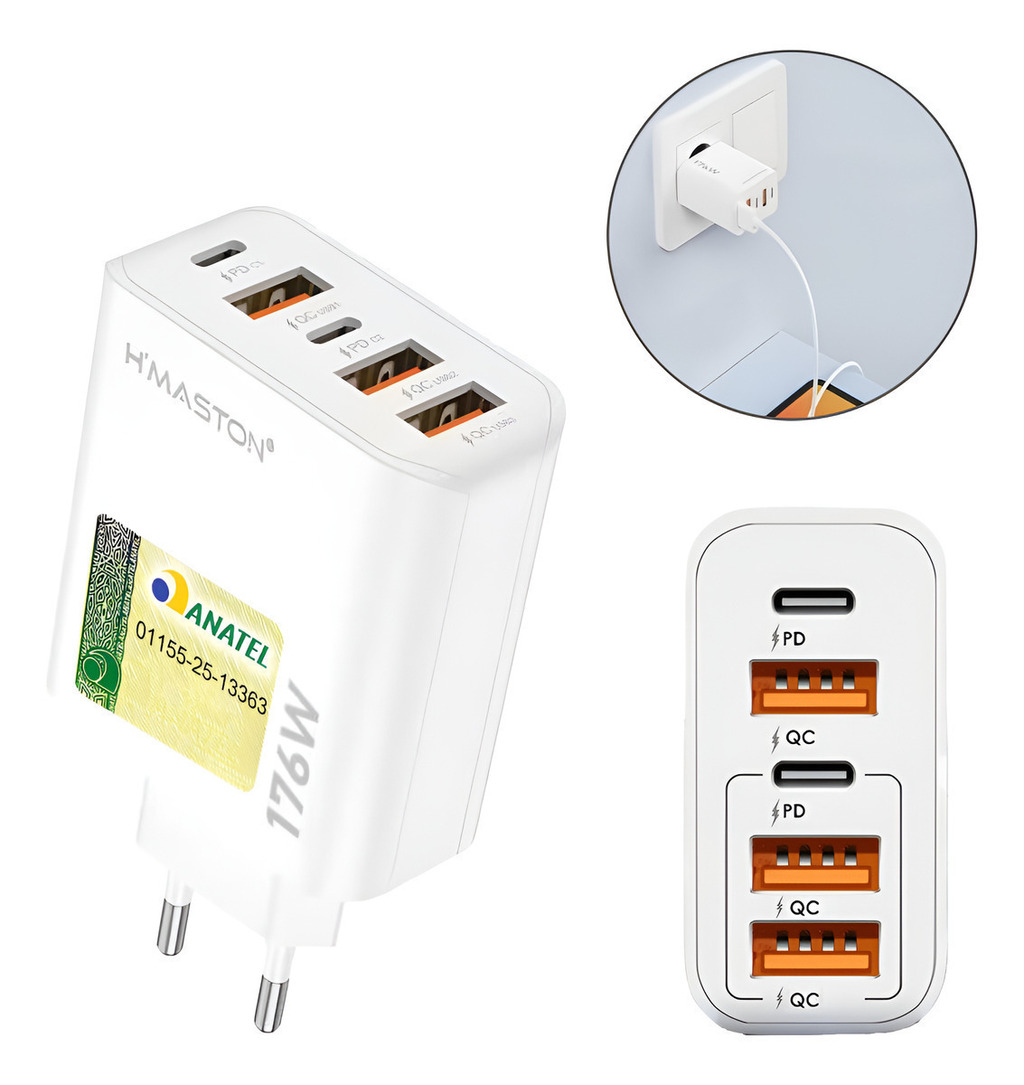 Este carregador entrega uma robusta potência total de 176W, garantindo um carregamento ultra-rápido para todos os seus dispositivos compatíveis.