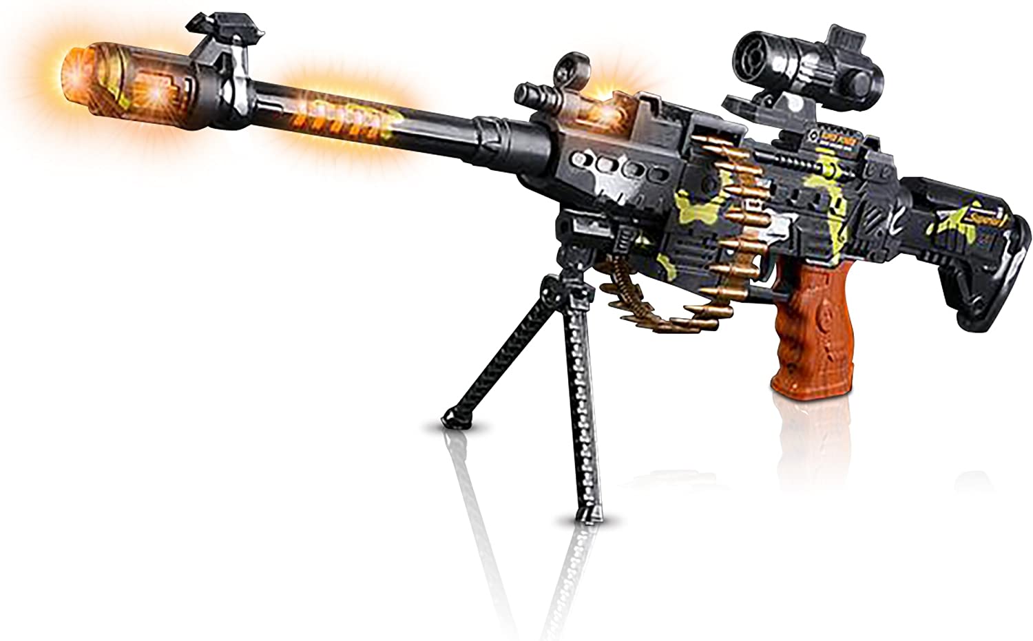 Metralhadora de brinquedo com luzes, sons, vibrações, movimentos de 360º em balas.