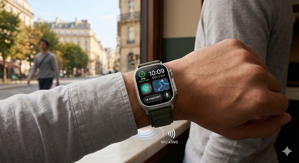 Inteligência Artificial (ChatGPT): Obtenha respostas rápidas, traduções e assistência por voz diretamente no seu pulso. A IA agora faz parte do seu dia a dia.