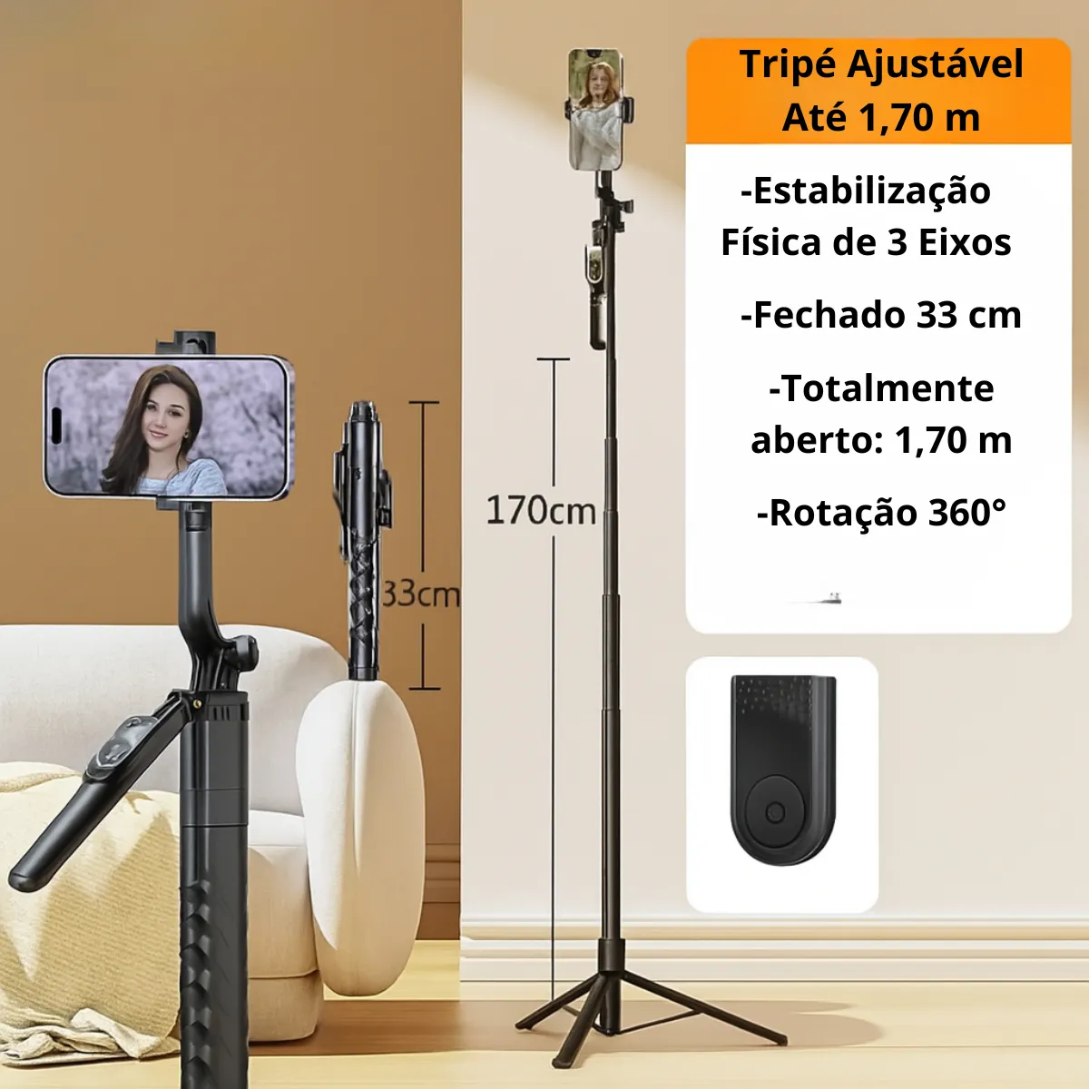 Seu grande destaque é a haste telescópica que alcança incríveis 1,70 metros, ideal para simular tomadas de drone, capturar paisagens vastas ou garantir que todos apareçam na foto de família sem cortes. Quando o trabalho termina, ele se retrai para um tamanho super compacto de apenas 19 cm, cabendo facilmente em qualquer bolsa ou mochila.